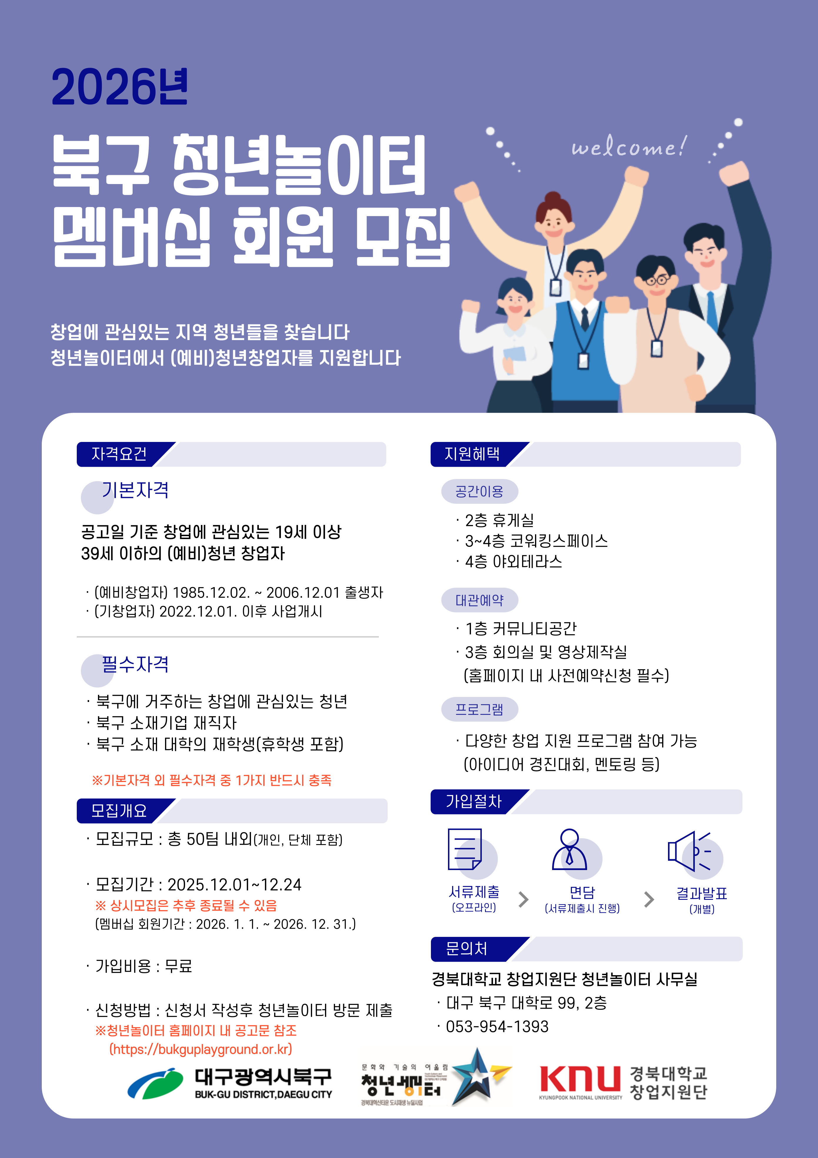 ■ 경북대학교 창업지원단에서는 '대구 북구 청년놀이터' 멤버십 회원을 모집하오니 많은 관심 바랍니다. ※ 자세한 내용은 첨부파일의 공고문을 참고해주시기 바랍니다...